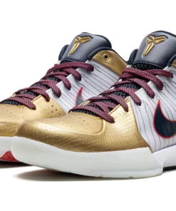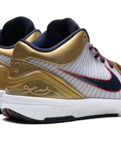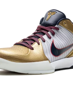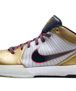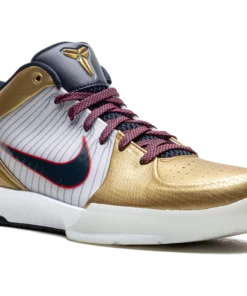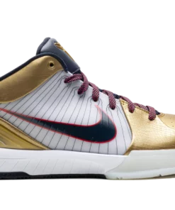 The Nike Zoom Kobe 4 Protro “Gold Medal” is a colorway of Kobe Bryant’s fourth signature shoe that debuted in 2009 and was reissued in 2024. Inspired by the late basketball legend’s captaincy of the 2008 Men’s Olympic Basketball team at the 2008 Olympics in Beijing, the “Gold Medal” is one of the most popular colorways of Bryant’s fourth signature shoe with Nike Basketball. The upper features Metallic Gold overlays on the toe, forefoot, and heel with a snakeskin texture in honor of Bryant’s “Black Mamba” nickname. Flywire cables appear on the white leather mid-panel. A Dark Obsidian Swoosh with red trim can be found on either side of the shoe. Bryant’s Olympic number “10” appears on the heel, and his “Sheath” logo with Nike is seen on the tongue. Release date: August 5, 2024 Gold Medal