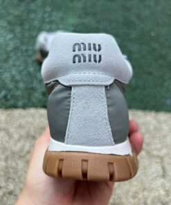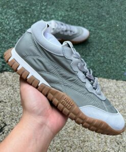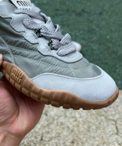 Miu Miu 5E930C Padded Nylon and Suede Lace-up Trainers – Khaki Green